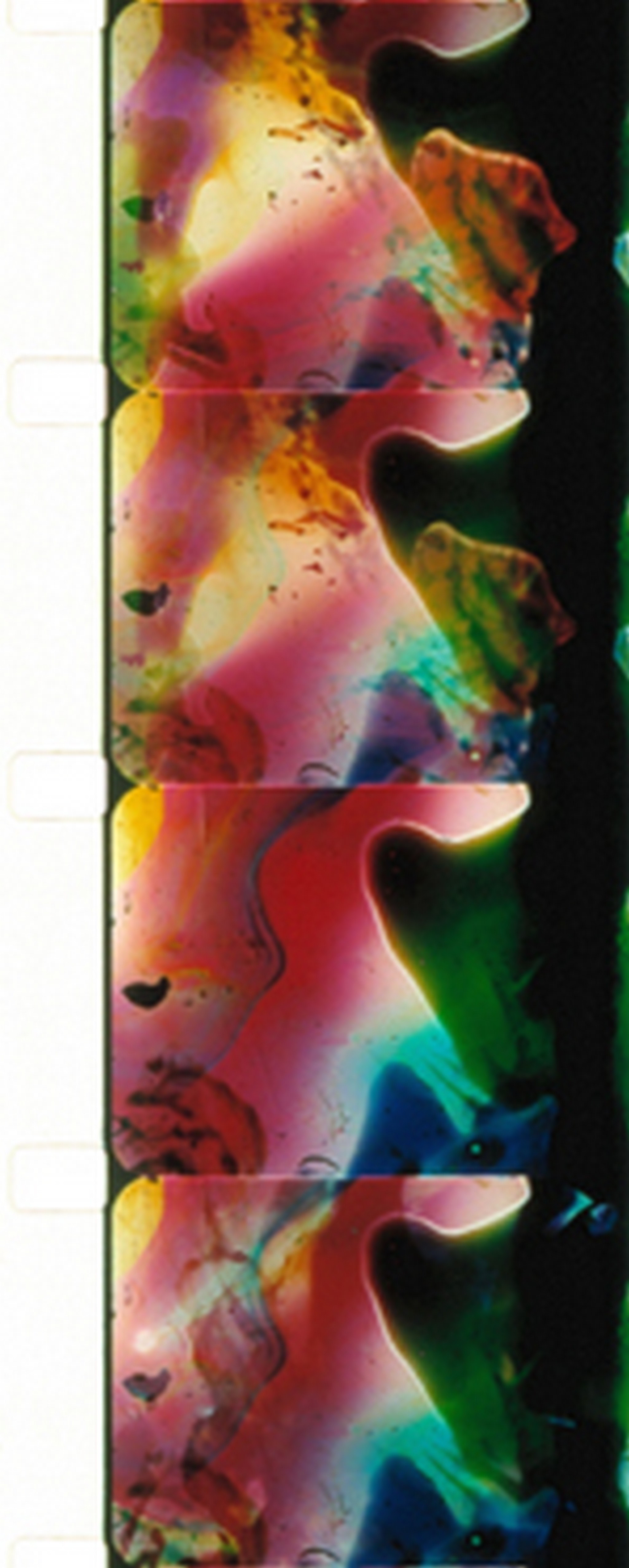 1) This hand-painted and elaborately step-printed work begins with a flourish of reds and yellows and purples in palpable fruit-like shapes intersperced by darkness, then becomes lit lightning-like by sharp multiply-colored twigs-of shape, all resolving into shapes of decay. 2) Multiple thrusts and then retractions of oranges, reds, blues, and the flickering, almost black, textural dissolves suggesting an amalgam approaching script. 3) Dark, fast-paced symmetry in mixed weave of tones moving from oranges & yellows to blue-greens, then retreating (dissolves of zooming away) to both rounded and soft-edged shapes shot with black. 4) Elaborate petal-like, stamen-and-stem-like, multicolored flowers rising in white space until the whole field is as if crushed by floral designs in madly-swift mixtures of every conceivable previous (in the PERSIAN SERIES) shape, evolving back to brilliant petals against what was as at beginning of #4. 5) Dark blood red slow shifting tones (often embedded in dark) / (often shot-thru with parallel wave-like lines) composed of all previous shapes AND flowers as if trying, linierally, to evolve a glyph-script. Stan Brakhage